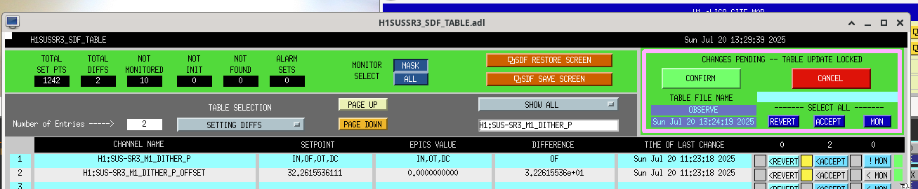 Finally had the opportunity (due to H1 Lockloss during my shift) to address the SR3 Dither Pitch Offset Oli noted last week (alog 85830), and I first looked at during a lockloss at the end of my shift Friday evening (alog 85855)---but my changes did not hold for the Dither Pitch Offset due to the H1SUSSR3 SDF needing its safe.snap changed/accepted.