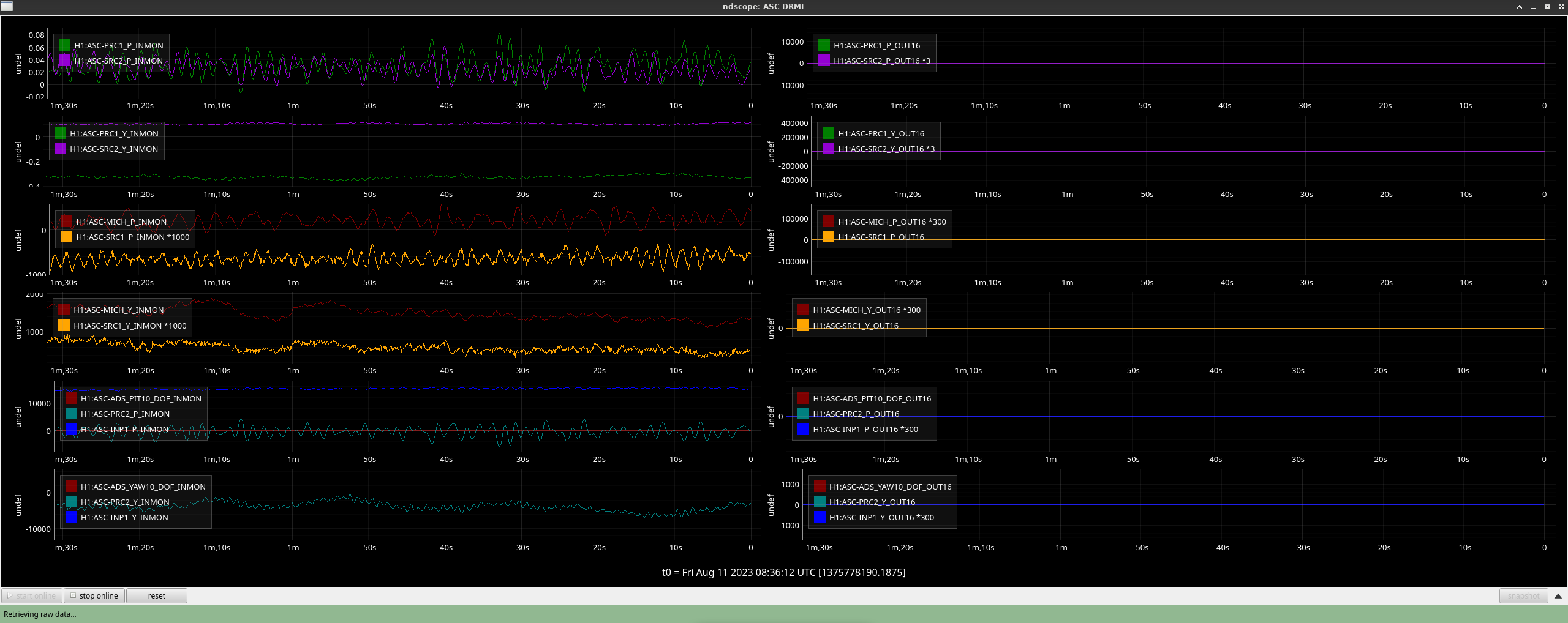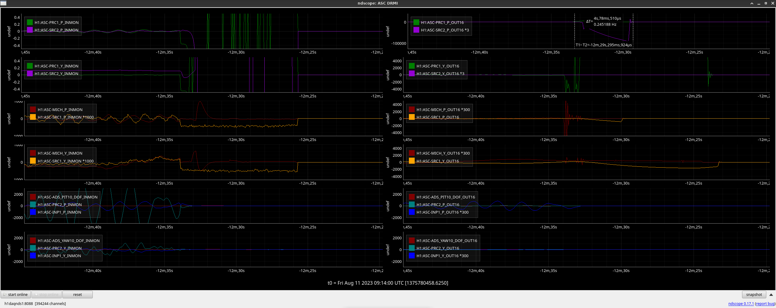Next, we tried halving the SRC1 gains, from 4, down to 2. Then, we tried to add back in the quartered SRC2 gains, which still yielded the same result. At this point, it was decided that we entirely leave the SRC2 loop off, while keeping the halved SRC1 P/Y loops and try to continue locking - this worked and we were able to continue locking. Eventually, guardian took over the ASC loops once we got to ENGAGE ASC, and we had no issues relocking afterwards. This should be looked at tomorrow during the day, but at least now we have a temporary workaround if we lose lock again.