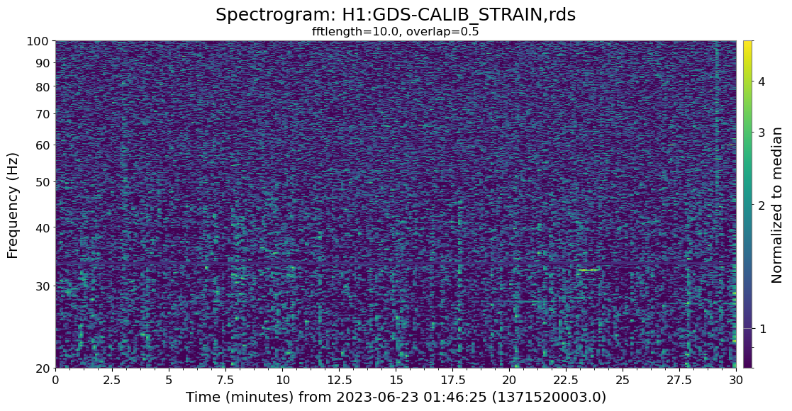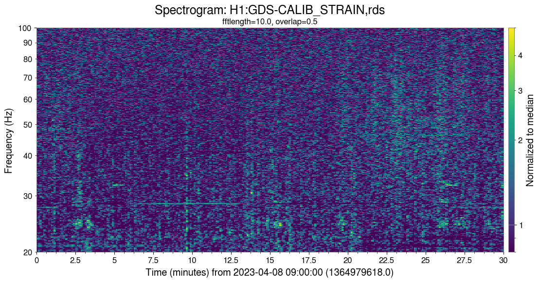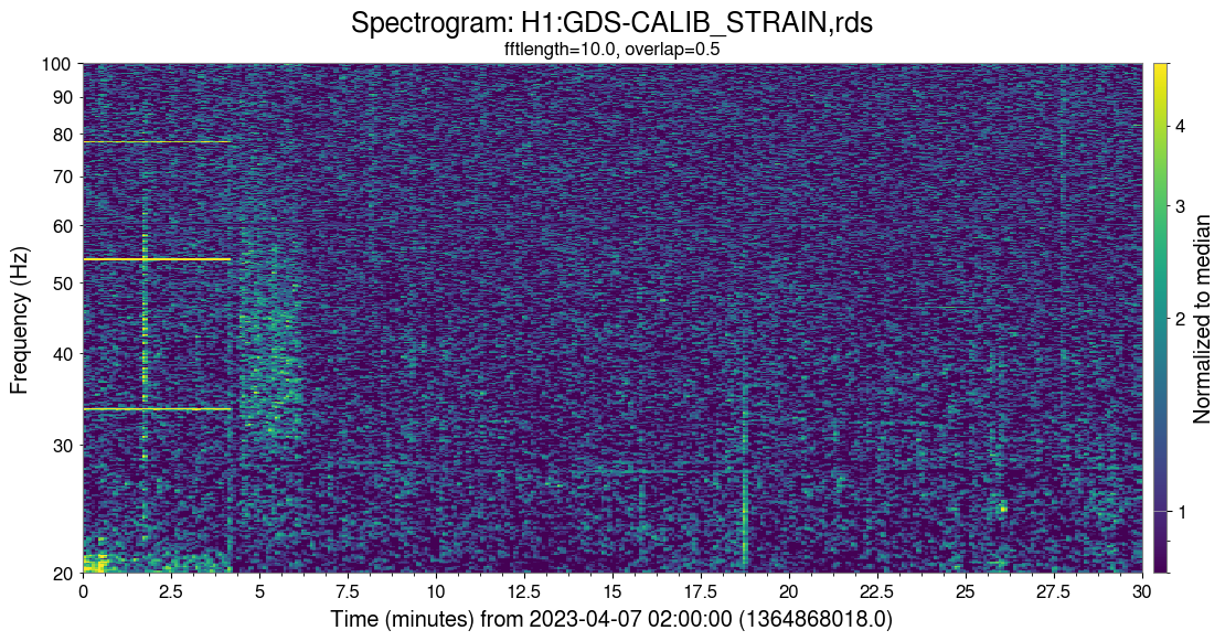 A DARM spectrogram shows bursts of noise below 60 Hz, happening from time to time. A better view is provided by a spectrogram of DARM whitened with the median.