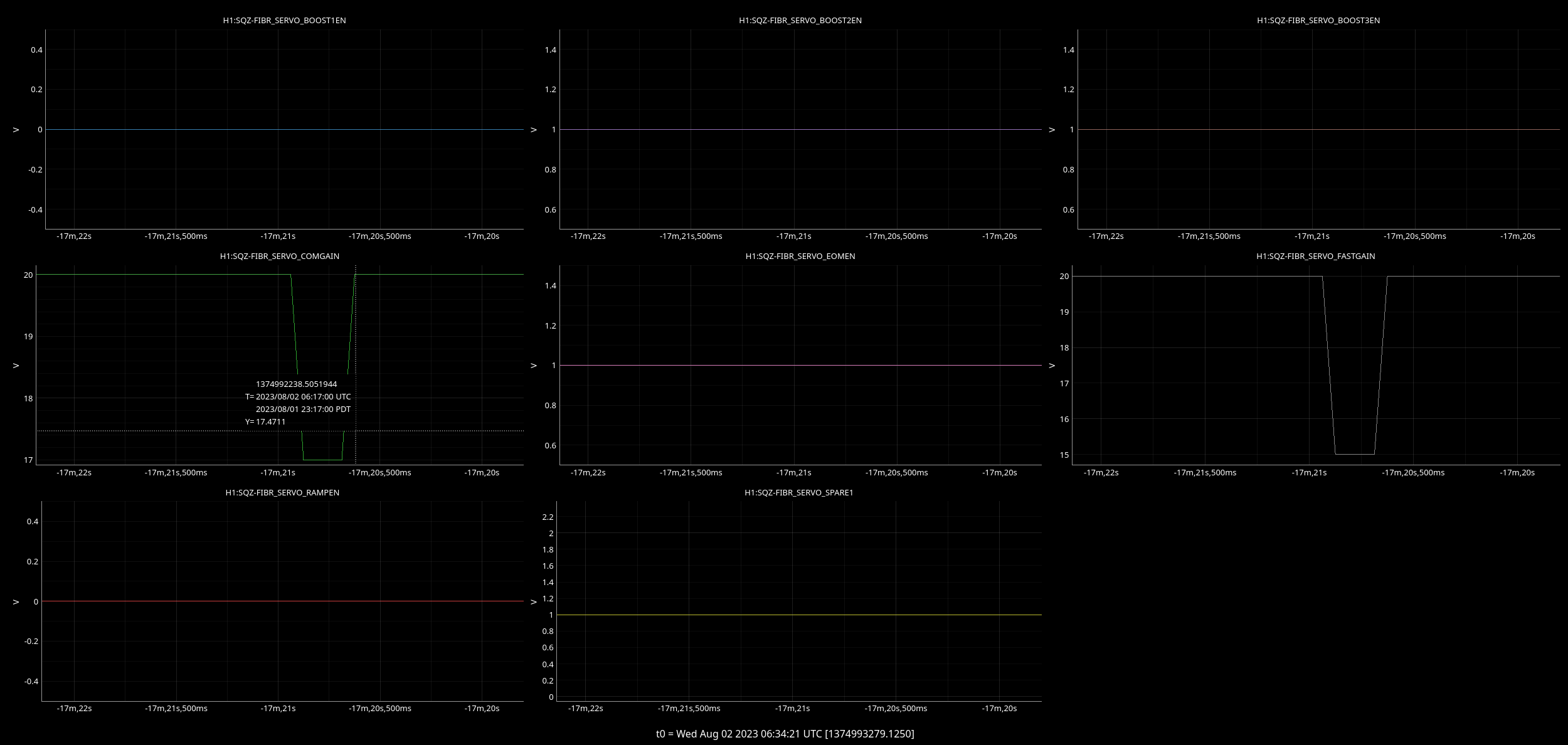 Attached is a plot showing the same culprits (H1:SQZ-FIBR_SERVO_COMGAIN & H1:SQZ-FIBR_SERVO_FASTGAIN) dropping to lower value for 0.5secs and then returning to their normal value.
