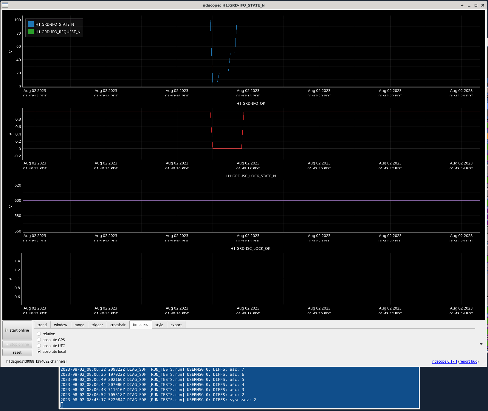 Last night we went out of observing for ~1 second with 2 SDF diffs on syscssqz. I can't get the channels, but we will keep an eye out.