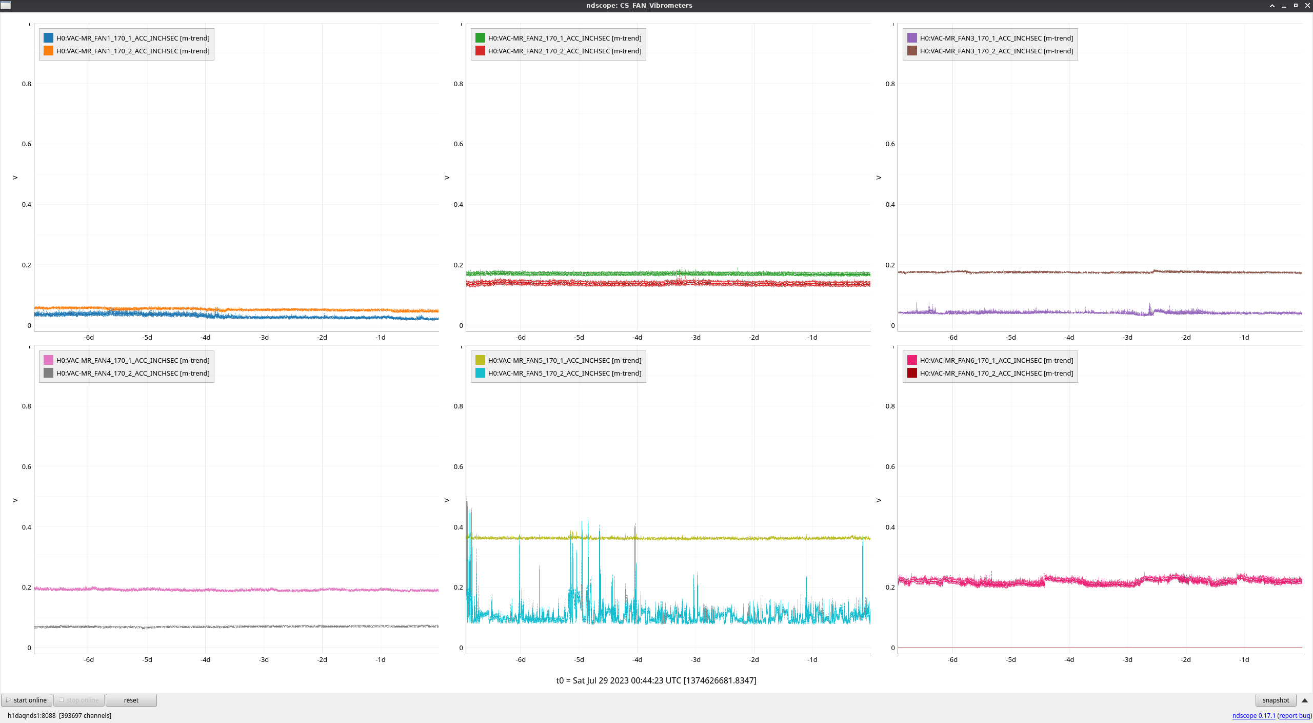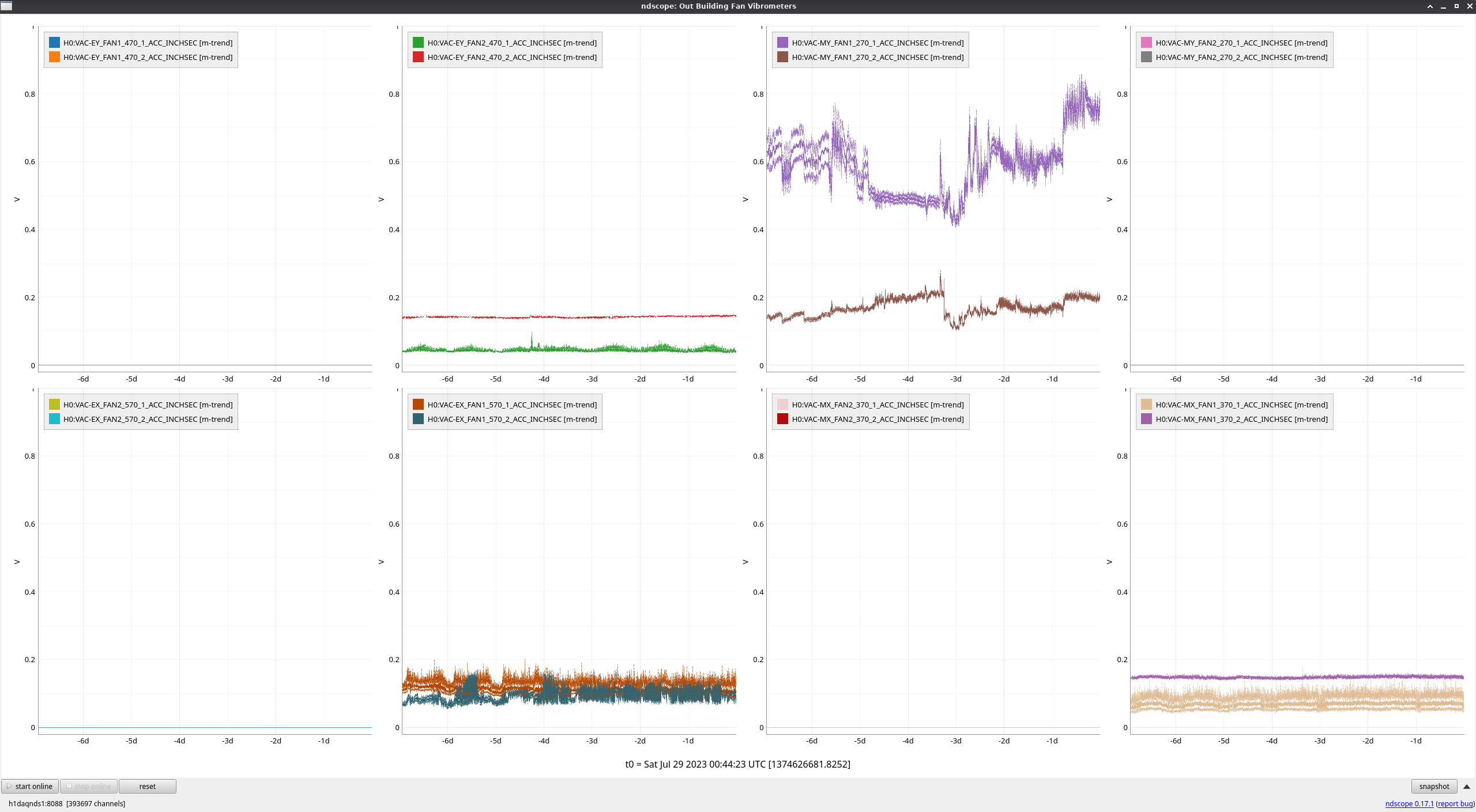 Since this set of fans was turned on, all of them look fine except for MY FAN1, which appears very noisy (above the arbitrarily defined threshold of 0.7 noted in the FAMIS ticket). This was first reported by Oli in the previous check and escalated to the facilities team.