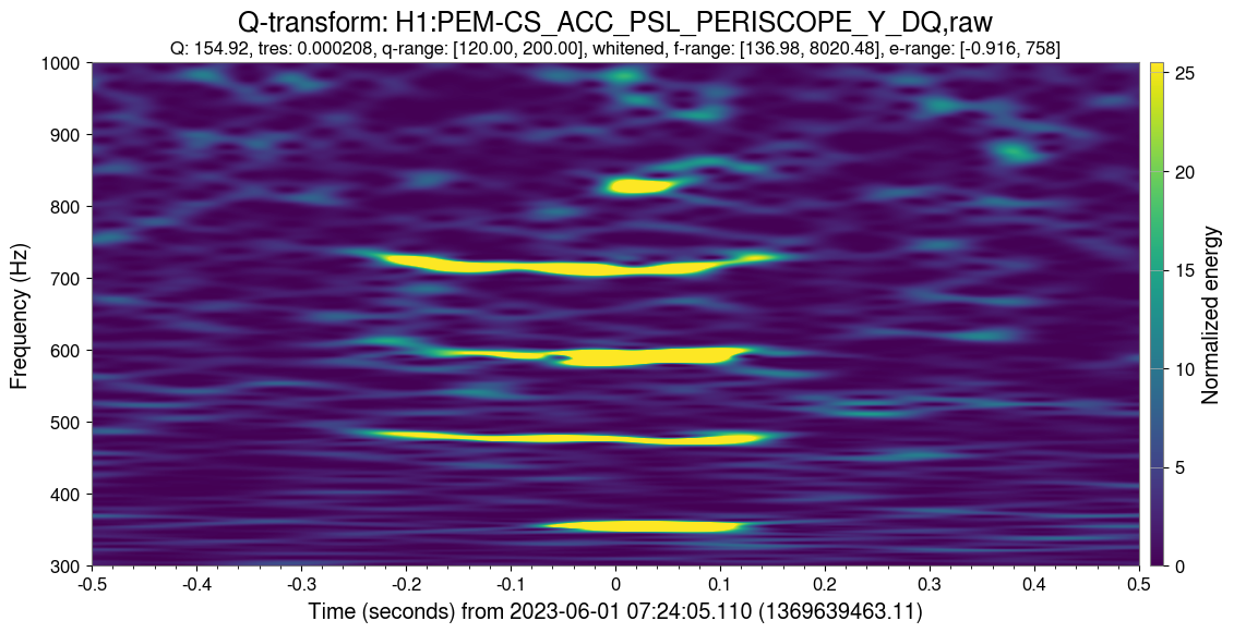 Marissa, Shania, Tabata, Gaby, Brennan, Andy GravitySpy volunteers noticed a new type of glitch that happened on May 31 and June 1 (GSpy link). Many of these glitches appeared as a high-Q line at 590 Hz, but they also appear as a stack of high-Q lines in the 100 to 600 Hz range, and sometimes only below 300 Hz (plot 1). The cause seems to be physical motion of the PSL periscope (plot 2) in short bursts. The coupling to DARM is through the periscope motion causing beam jitter (plot 3). The MCL/REFL_SERVO loop are also witnesses. Some of the glitches in the periscope are broadband, while others have a few well-defined frequencies (plot 4). There was an increase in the motion of the periscope during this period, seen by BLRMS of the periscope accelerometer (plot 5). The motion was still elevated above the previous level when this period ended. This kind of jitter glitch has occurred again in short bursts in some later days, but not for sustained periods. Scans of selected times are at this link (needs LVK login). Note that this configuration does not include the jitter or periscope accelerometer channels.