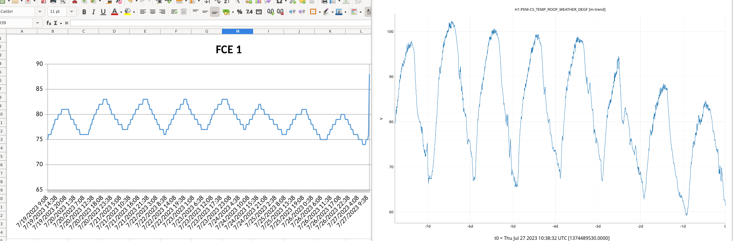 Outside temperatures have been quite hot in the last week, near 100F at times. Luckily though, it looks like the temperature sensors in the FCTE are reporting ~15F below that. The attached plots are of the same time frame and I tried to scale as closely as possible. the FCTE clearly doesn't see the same extremes with its diurnal temps.