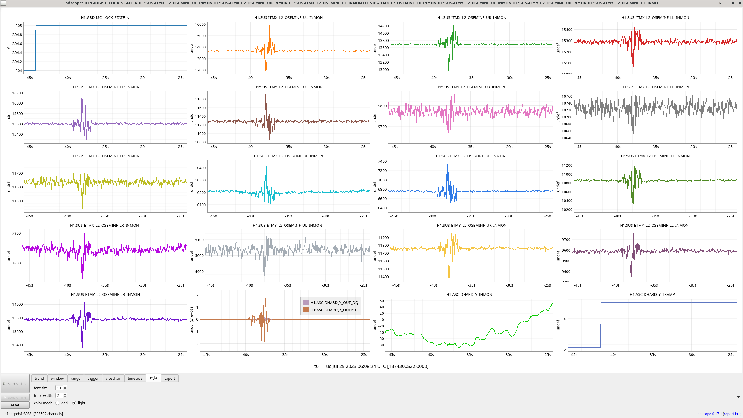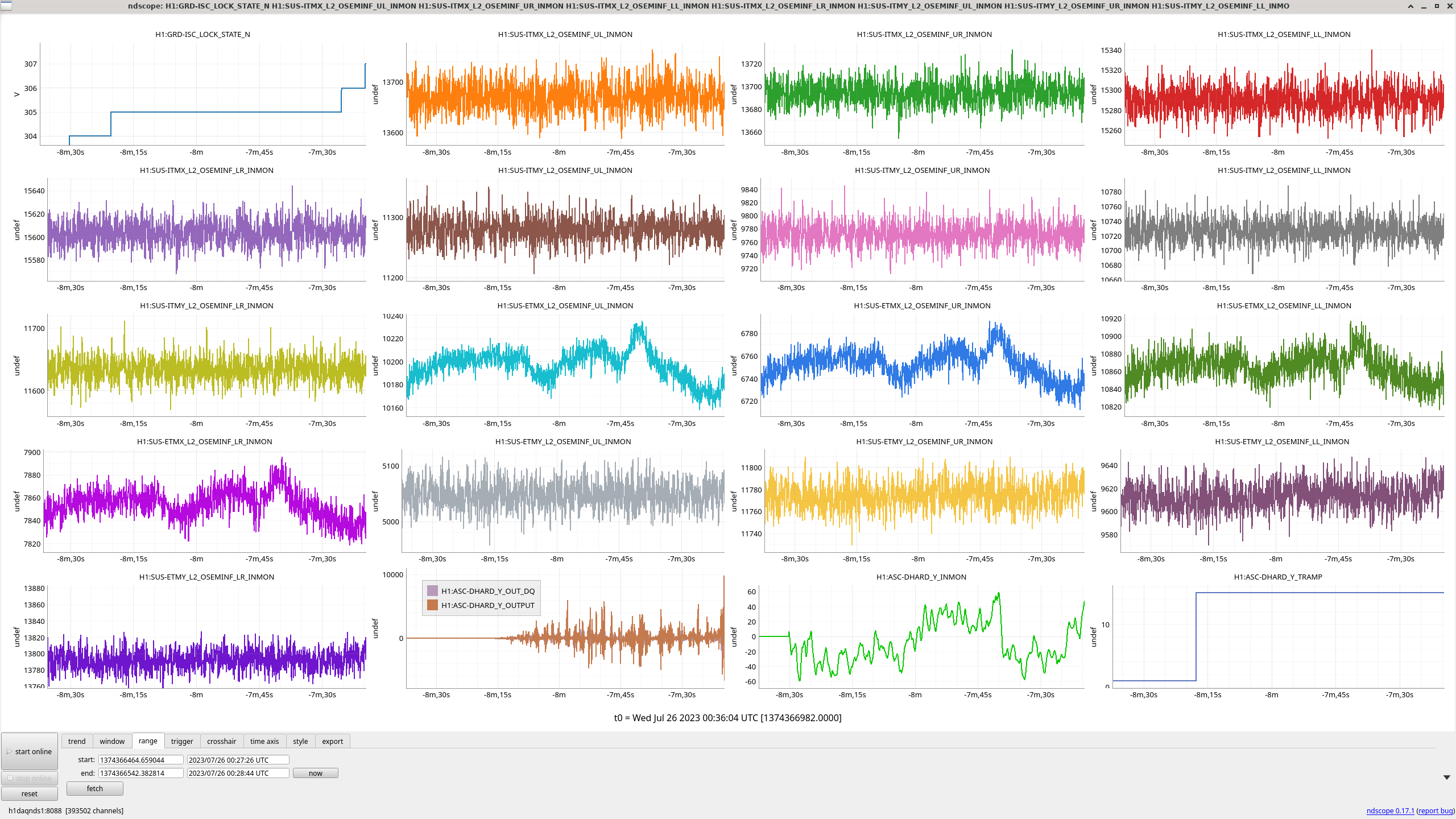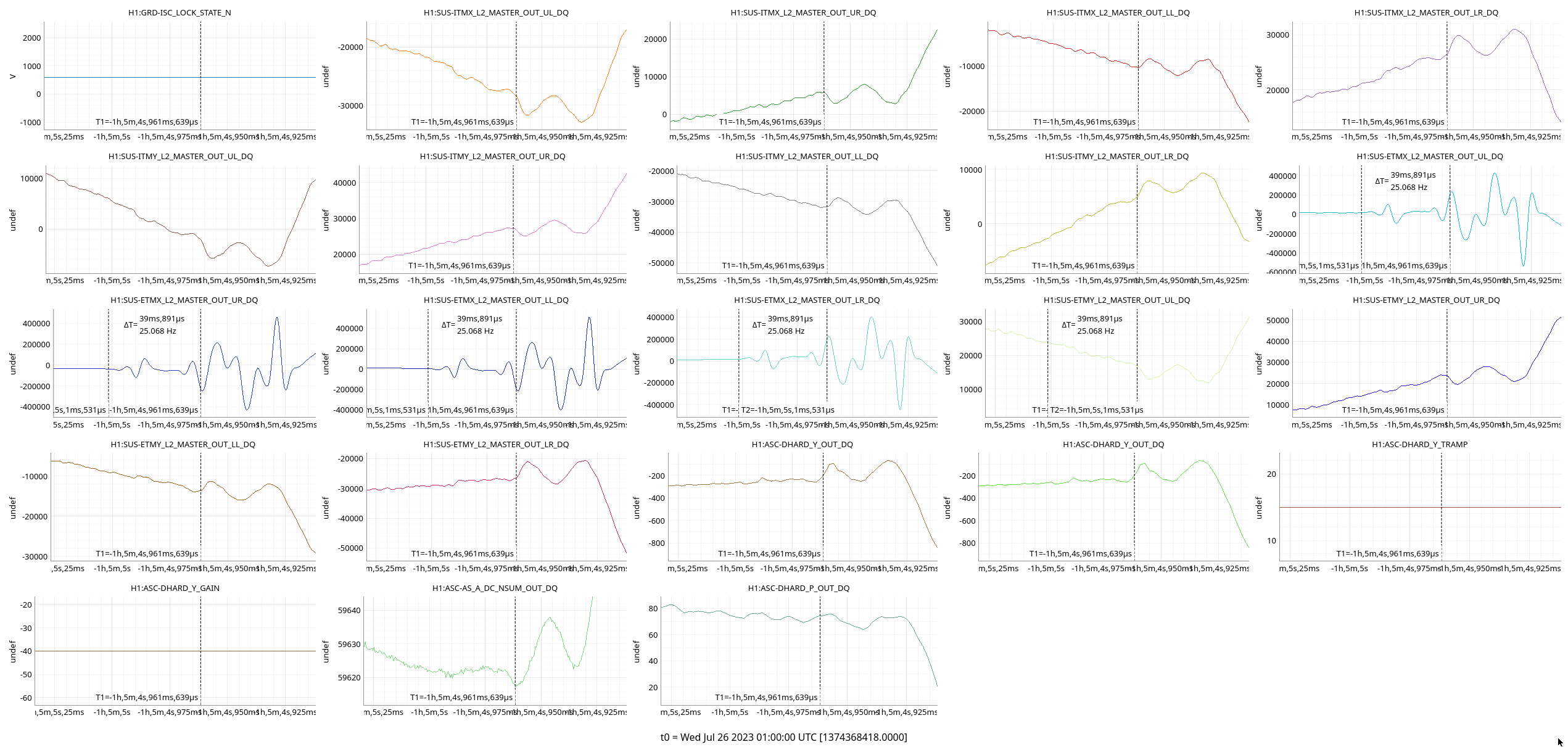 Derek, Iara, Zach Following up on Vicky's request to determine if the continuous turning on and off of the ESD drive in response to PI ringup is causing noise. We examined 28 June 2023 at 07:25 UTC and 19 July 2023 at 16:19 UTC where the ESD drive was repeatedly turned on and off. We referenced strain and omicron segments for the same times and found no significant increase in glitches or average strain. We find no additional noise from the engagement of the ESD drive. Additionally, we notice no significant difference between the time periods when the ESD drive is on vs. when it is off. Attached are images of the PI ringups and resulting ESD damping and the corresponding times in strain and omicron.