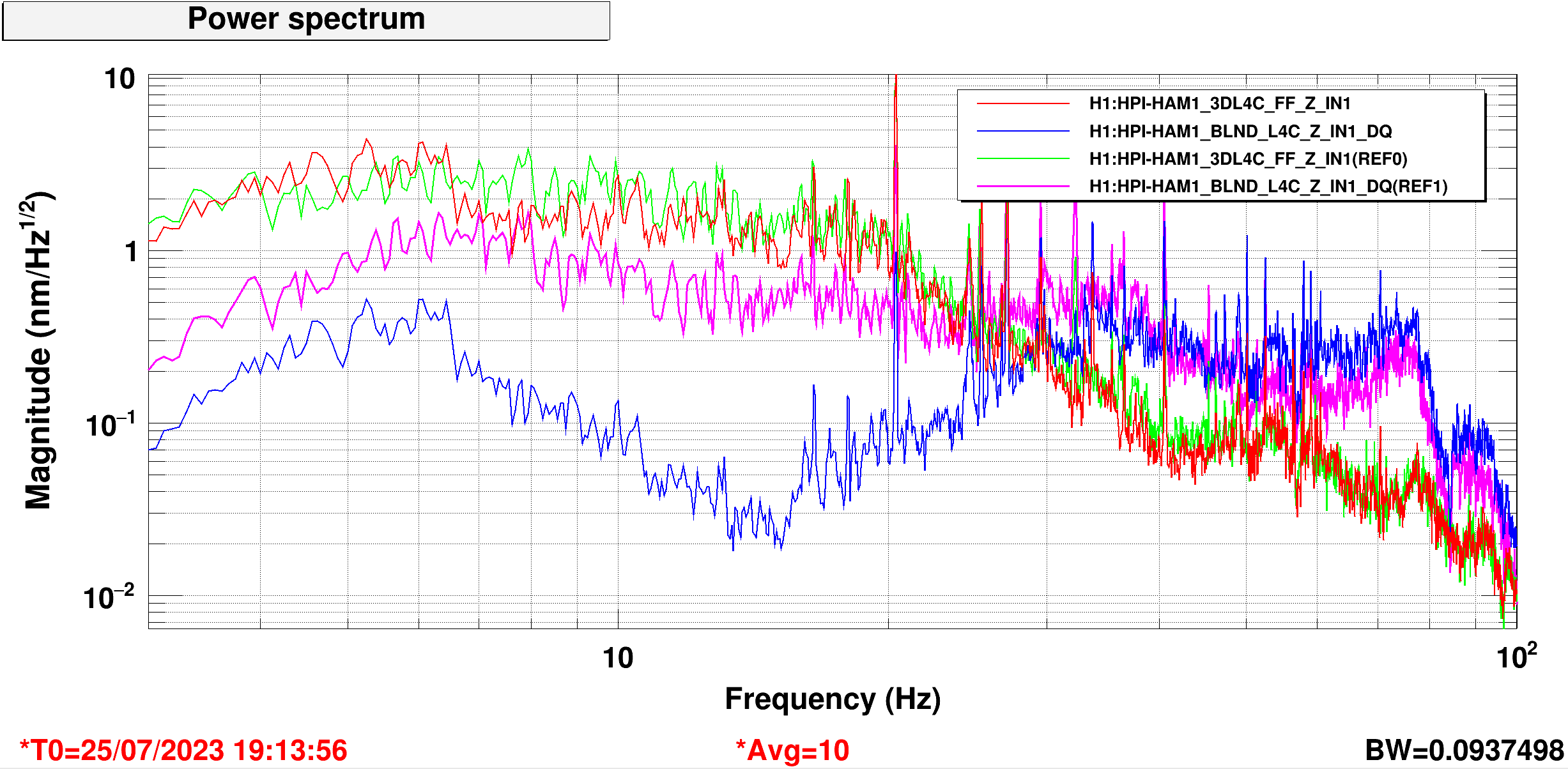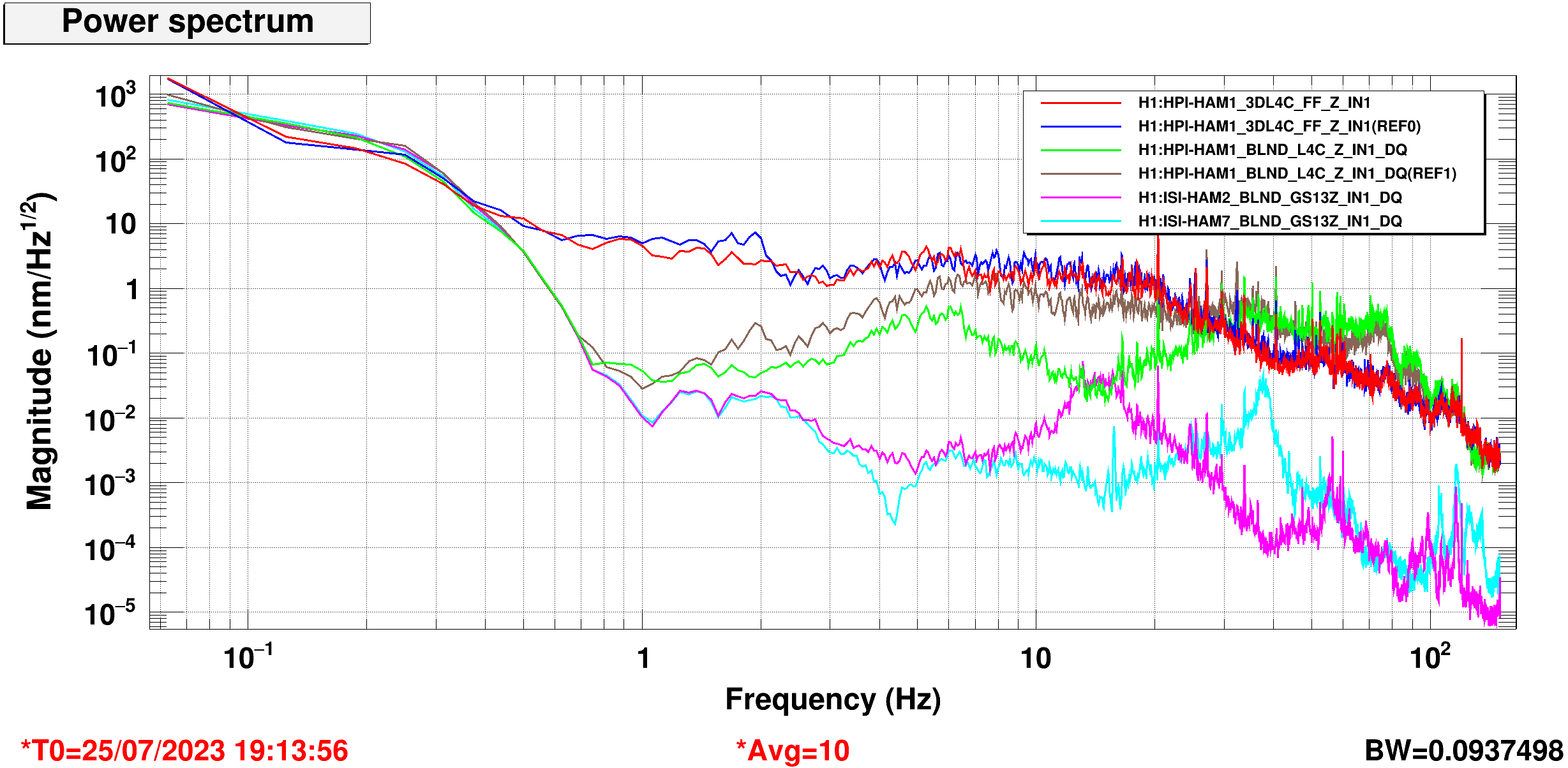 Second attached asds compares the HAM1 improvement to some of the other HAM ISIs. Brown is the HAM1 HEPI with FF off, greens is with the FF on. Pink is the HAM2 GS13s and light blue are the HAM7 GS13s. Basically, HAM2 is doing as good HAM1 at 15hz, without additional FF and doing better by factors of 10 or more everywhere else. HAM7 is better than either by ~20 at 15hz, because of in-vac FF L4Cs and its stiffer support structure, which shows up as the peak in light blue at 38hz.
