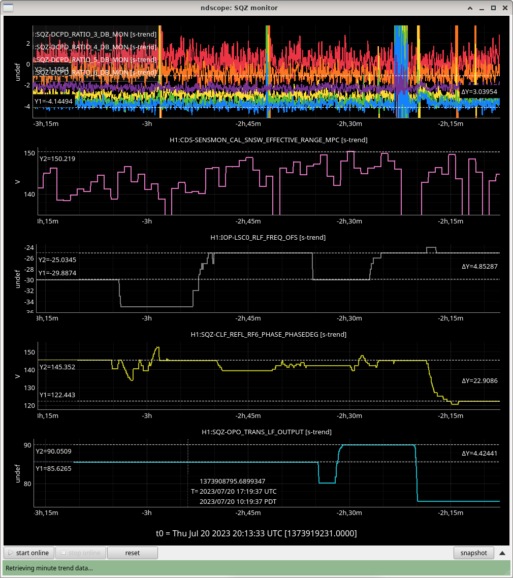 For now, I have left the squeezer in the "yellow" configuration from above (previously we were in "brown" configuration). Differences are 90uW OPO trans (compared to 85uW), and filter cavity detuning at -25 Hz (instead of -30 Hz). Squeeze angle is the same, 145 deg. In SDF, I've accepted the FC detuning change, and OPO temp change. I think the difference might be marginal at best, but interested how it goes when IFO is thermalized. Screenshot showing ~2 hours into lock in the black trace here, looks similar to the yellow.