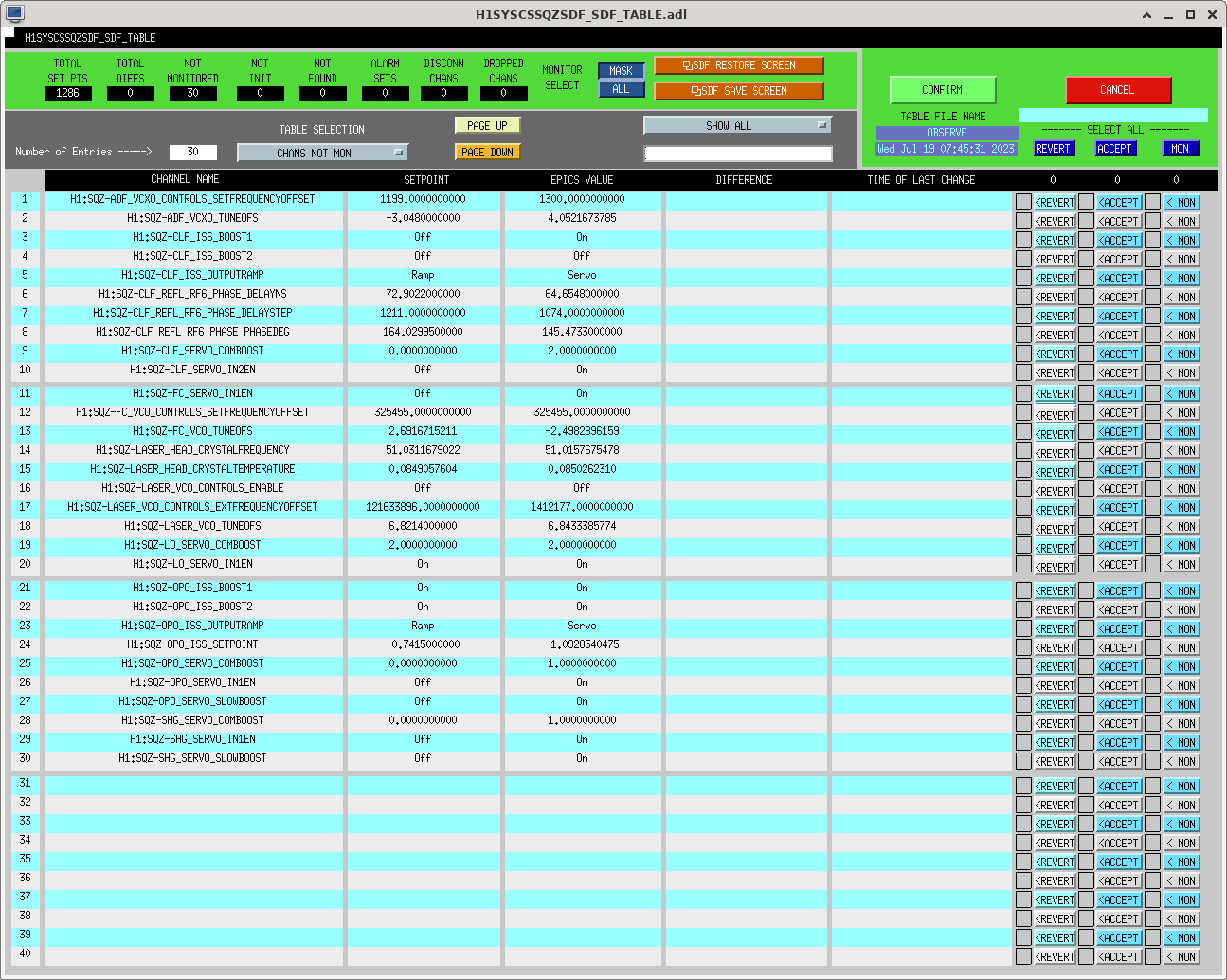 We looked through the SQZ slow controls channels and saw that there were 30 unmonitored channels in the observe.snap, we've monitored many of them. The two attached screenshots show the before and after list of unmonitored channels. We've left unmonitored the sqz angle, and various channels that will be different lock to lock.