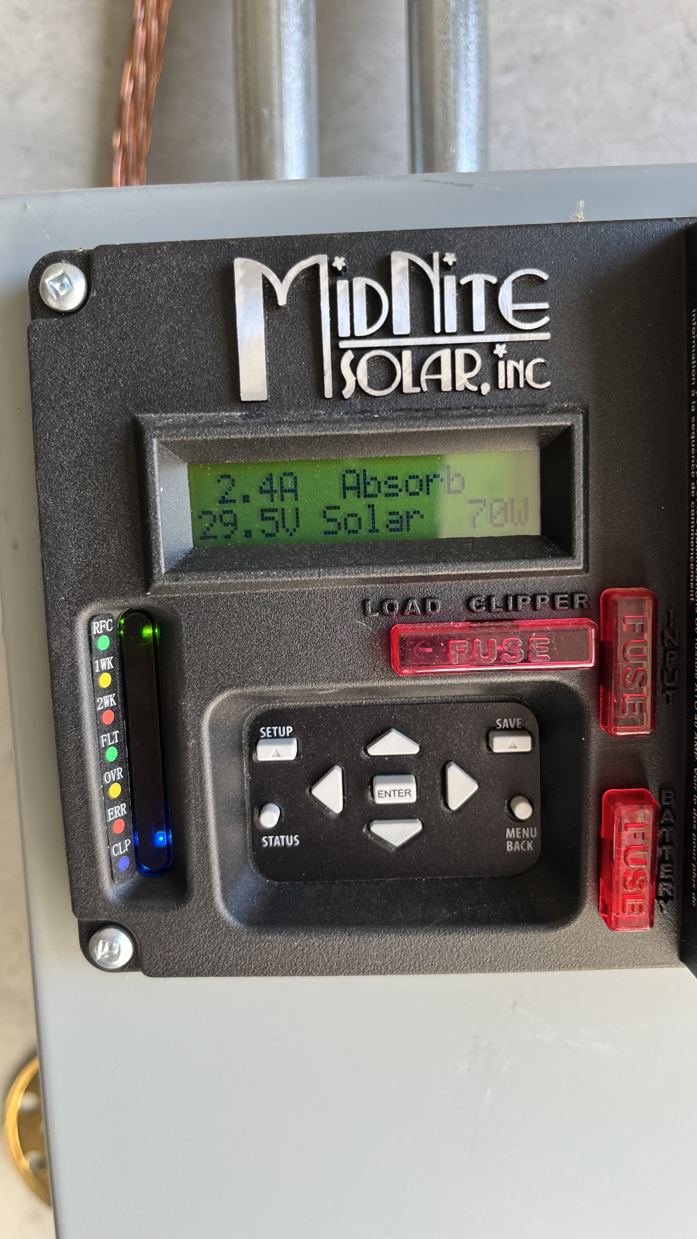 The LCD readout at the charge controller showed for both batteries 29.50 VDC, measured with clear skies.