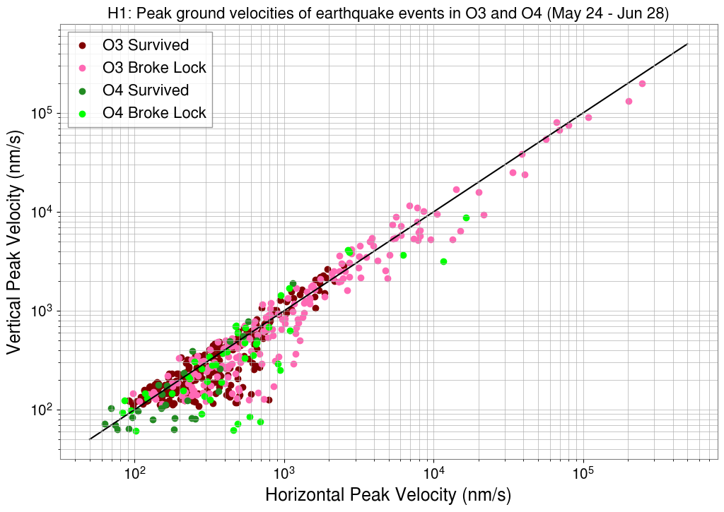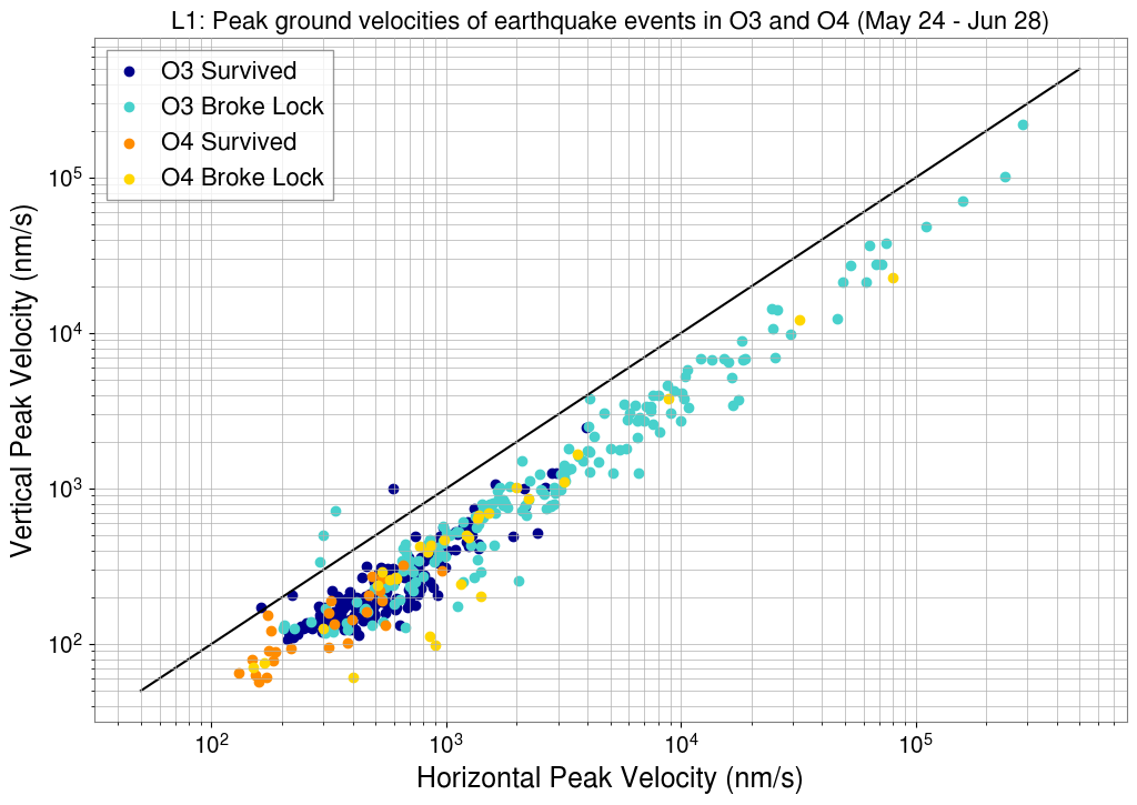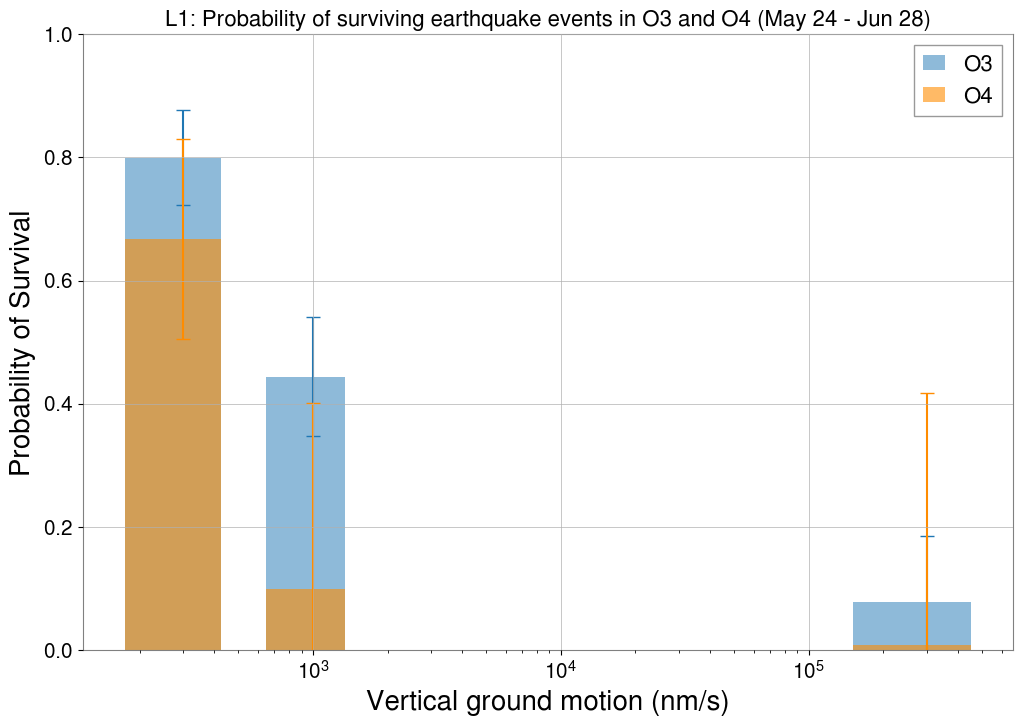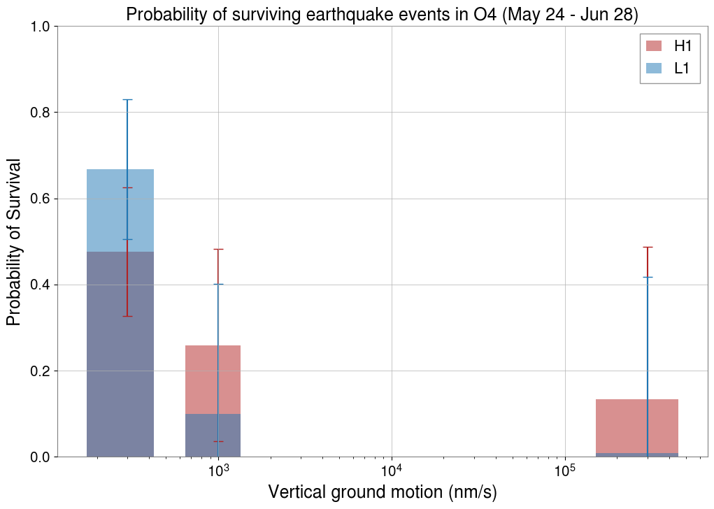 In O3, there were 434 total earthquake events detected at H1; the detector lost lock for 194 and survived 240 of these earthquakes. In the first five weeks of O4 (May 24 - June 28, 2023), there were 73 total earthquakes at H1; the detector lost lock for 46 and survived 27 earthquakes. Thus, the probability of survival at H1 for O3 is 0.530 and for O4 is 0.370.