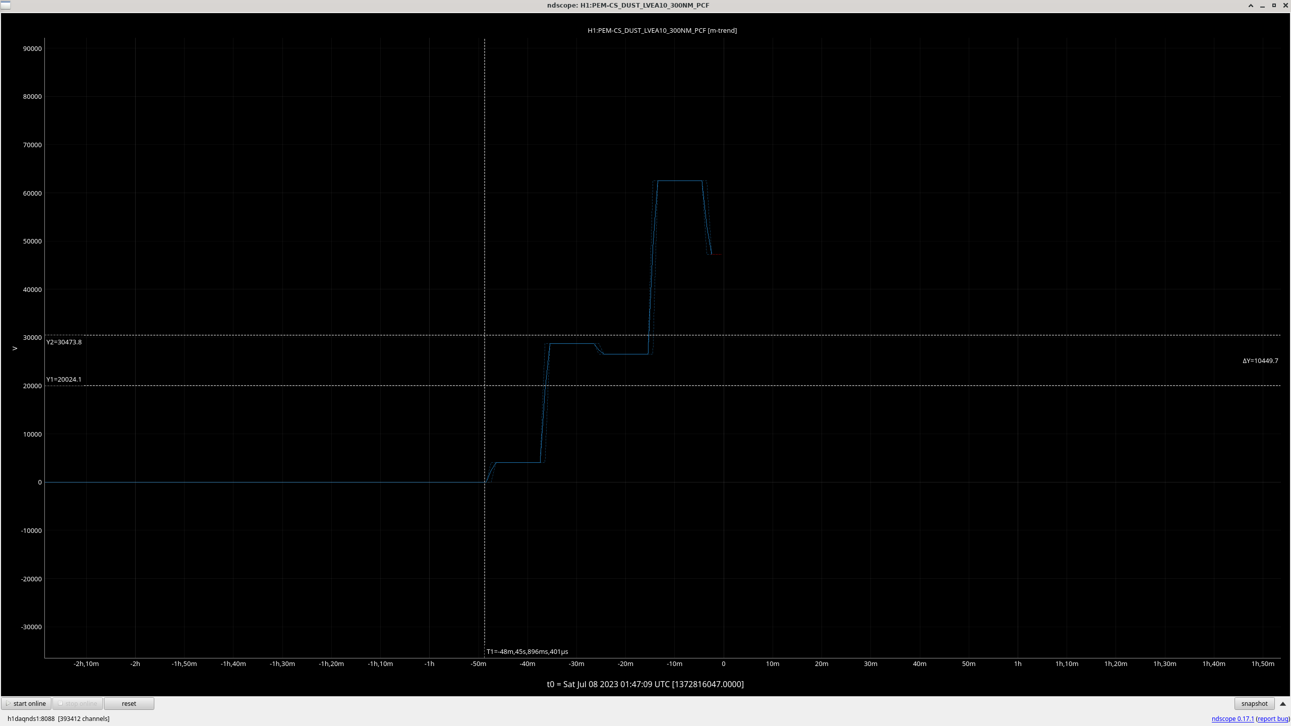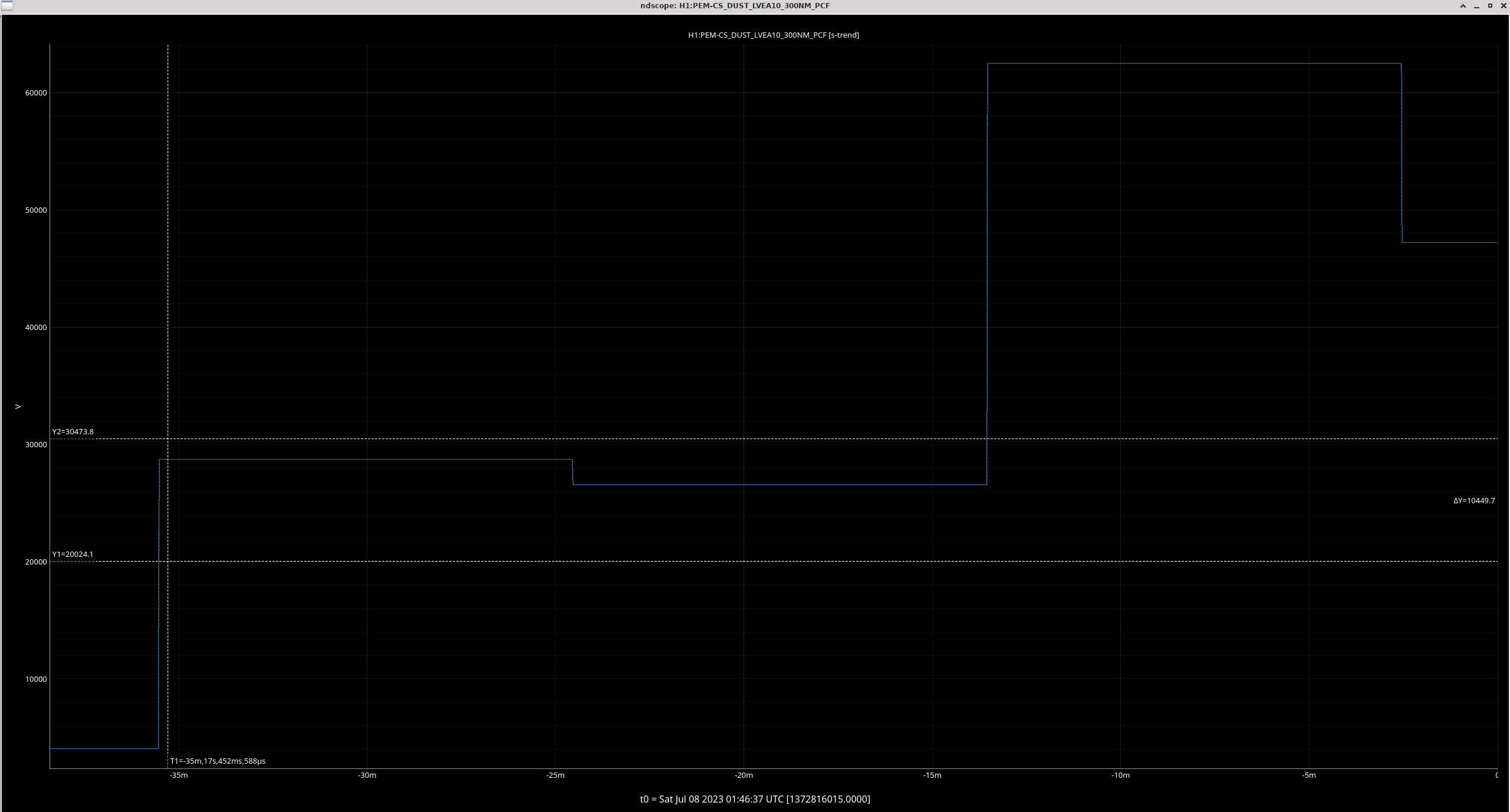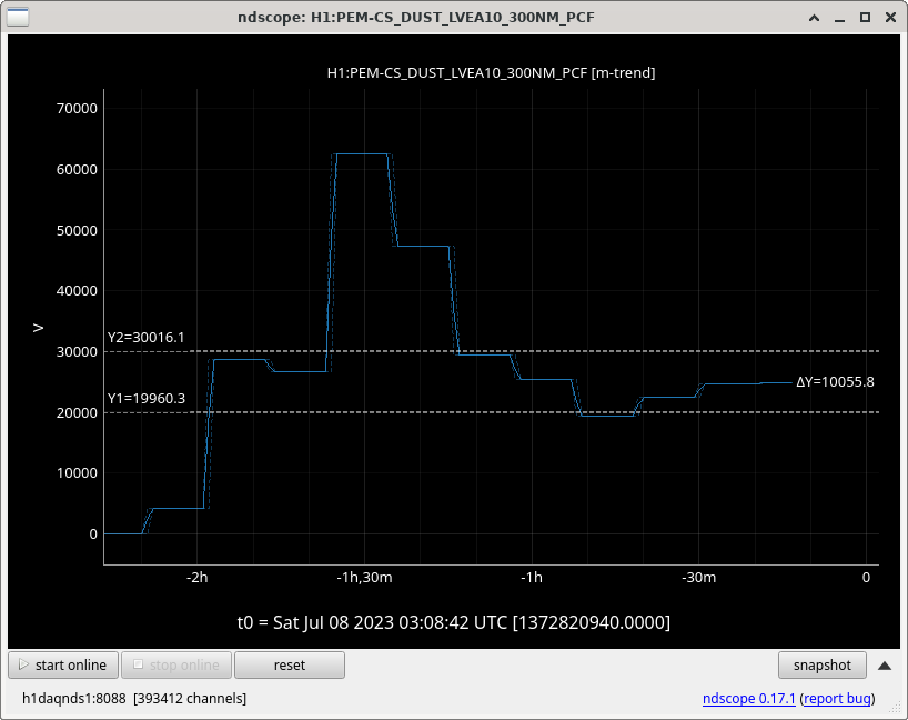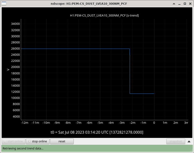 LVEA10 Dust Monitor (beer garden according to wiki) 300NM and 500NM increased rapidly starting 1:10 UTC. The 300NM counter went past the minor threshold (yellow alarm) at 1:10 UTC and past the major threshold (red) at 1:30 UTC, where it peaked at 62k counts (the threshold for red alarm is 30k at present). Called PEM contact to no answer. 500NM did not increase to the yellow threshold). Thankfully both have been steadily and slowly decreasing for the last hour (but quite slowly). This is the highest dust event for this particular monitor since Apr 18th 2023 and the cause for this kick is still unknown (wind has steadily been decreasing so it's not that). Screenshots of various stages of this scope are below. (the vertical y-lines denote the two alarm thresholds). As of now, the dust count is 25870 - which is right between the minor (Y) and major (R) alarms. It has fluctuated in this area for the last hour, only sampling below 20k once. UPDATE: While writing this, the dust monitor counts finally settled to ~11k counts, the lowest it has been in around 2 hours and the largest decrease in that much time. Screenshot 4 illustrates this. As of now, the count is 11350 counts with nothing else of note.
