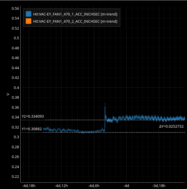 Outbuilding Fan Vibrometers: Around 4 days ago, EY_FAN1_470_1 jumped from 0.31 to 0.33 counts (3rd screenshot zoomed in illustrates this). Compared to last week, this is a new increase. Compared to last month, it is within normal fluctuation (and rather, last week was just particularly low vibration). However, prior fluctuations were gradual unlike this sudden, glitch-form spike.