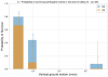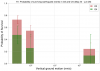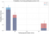 Four of the attached plots show the peak vertical/horizontal ground velocities of each earthquake and if the detector survived or not. Each of these plots is followed by a histogram of the survival probability at different bins of vertical velocities. Information about the number of survived and total earthquakes in each bin is provided beneath each set of plots. All probability plots are separated by the same peak vertical velocity bins: [50, 300, 1000, 300000] (nm/s). The error bars are calculated as 1/sqrt(total earthquakes in bin).