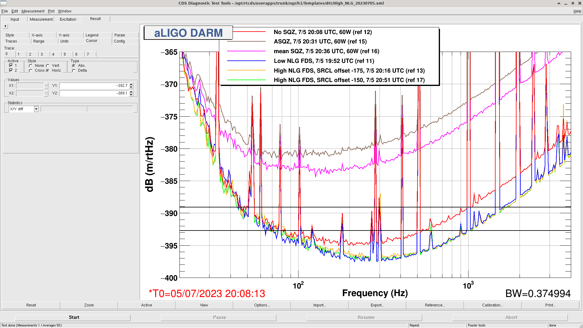 Re: technical noise limitation, here's a reminder of this log from Naoki 69767. Classical noise corresponds to an effective / apparent loss in the squeezing level, like the ratio (classical noise asd / no-sqz noise asd)^2. If this ratio is e.g. 0.3, this looks like an apparent loss of (0.3**2)~10% in the observed squeezing level. edit: Noted by Daniel, that Sheila's recent cross-correlation estimate of classical (non-quantum) noise 70891 suggests that at 1kHz, classical noise is ~40% of shot noise without squeezing, this is like an apparent sqz loss of (0.4**2)~16%. This technical noise is an extra loss, contributing to the difference between observed sqz vs. anti-sqz levels.