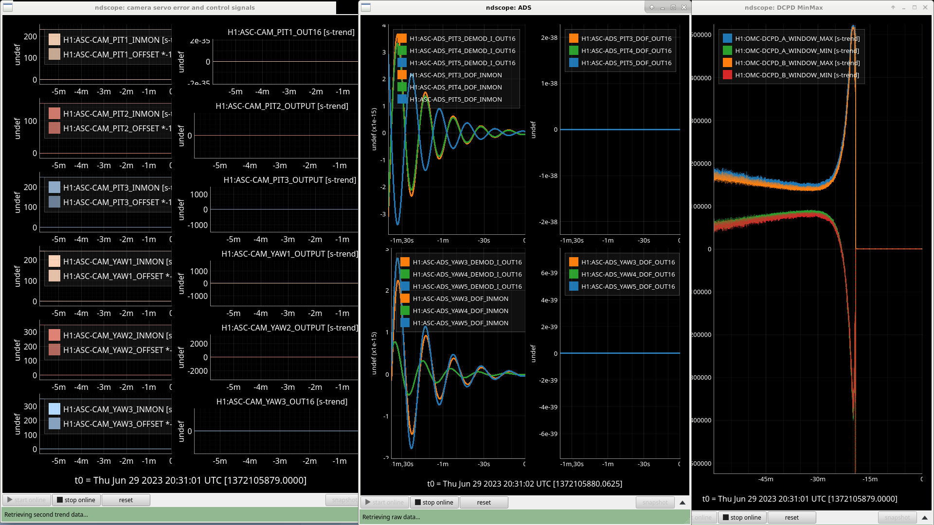 00:19 UTC H1 Dropped out out of OBSERVING and into COMISSIONING due to the CAMERA_SERVO Guardian detecting that the ASC-CAM_PIT2_INMON & ASC-CAM_YAW2_INMON was "stuck" for 5 seconds. The Guardian node took itself to TURN_CAMERA_SERVO_OFF. The Guardian node was in this state for less than a minute. It then took itself back to CAMERA_SERVO_ON. This was also seen in the Guardian log. Please See attached ndscope Screeneshot.