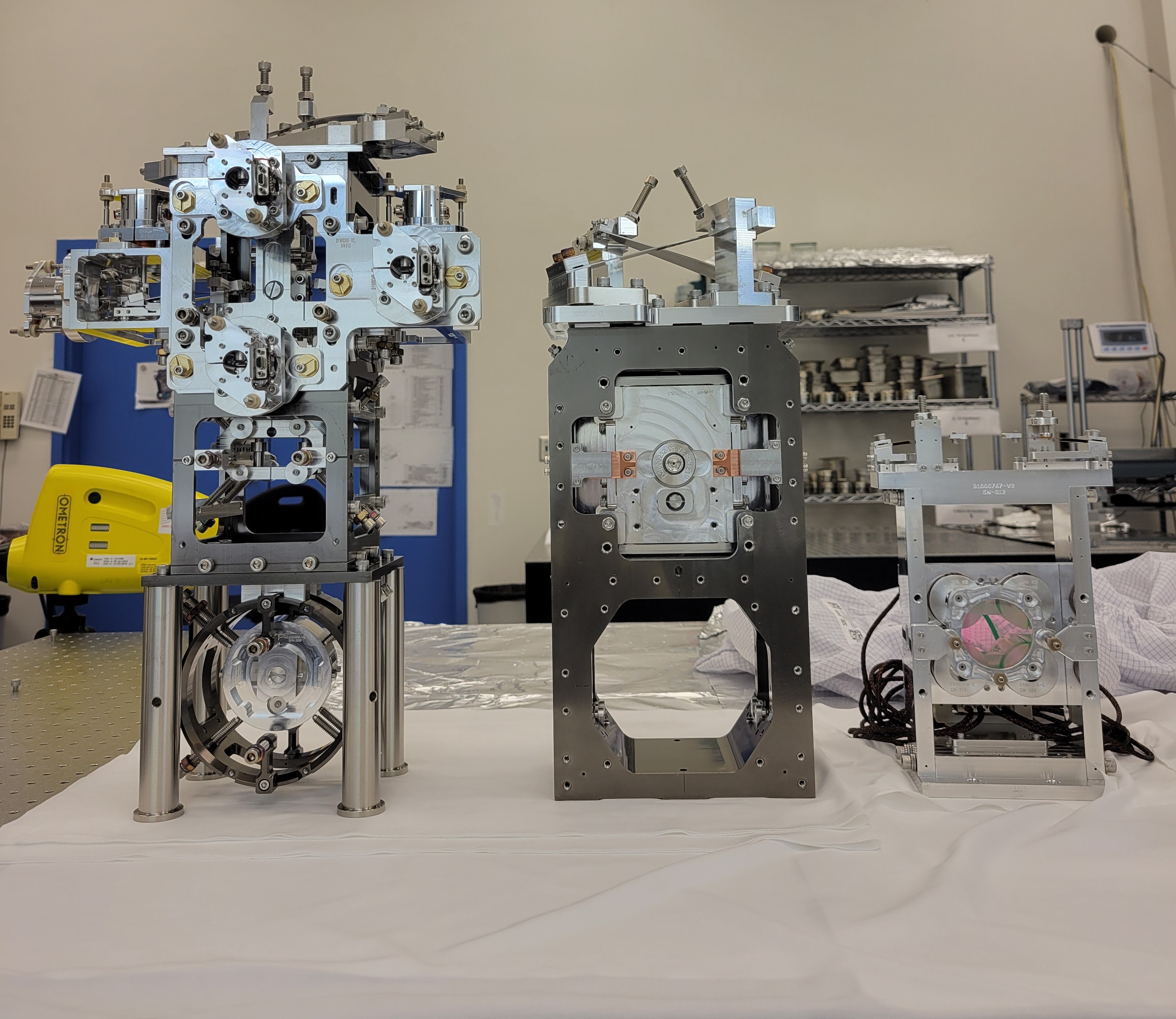 Also here's a side by side of the upgrade small suspensions, in order the HRTS (suspended configuration that will attach to the BBSS), the HXDS, and the HTTS (tip tilts). None of the suspensions have their bottom stage optics in yet (the tip tilt has an old optic in it currently).