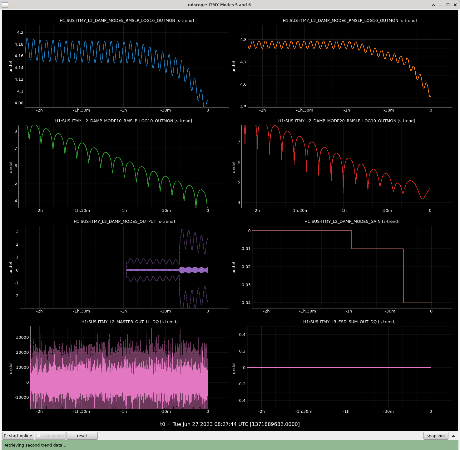 ITMY modes 5/6 damped fine once I engaged the nominal damping settings (IY05 @ -0.04). As the modes were rang up the VIOLIN_DAMPING guardian had set IYmode5 gain to "max_gain" value of 0, we could change this to -0.04 or -0.01, tagging SUS.