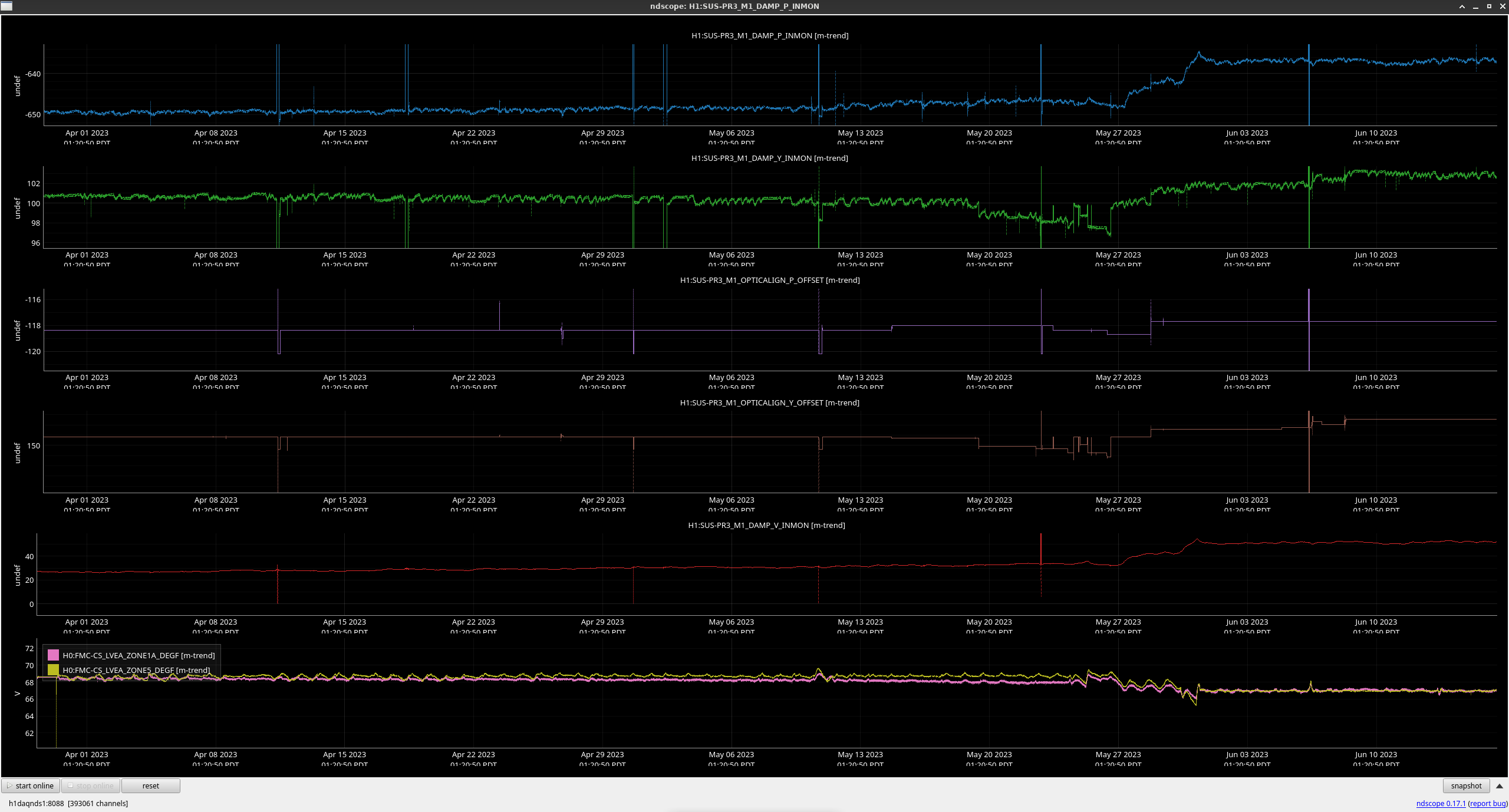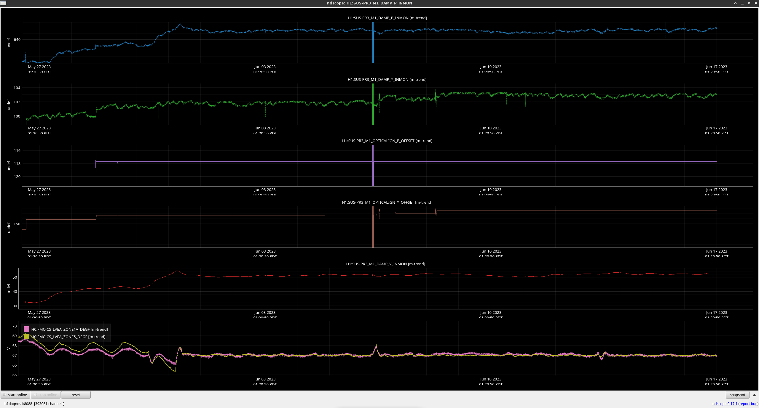 I have trended the top mass OSEM inmon channels, the optic align offsets, and the FMCS temps for zone 1A and zone 5, both over short term (~3 weeks, around the start of the excursion), and over a couple of months. From looking at the plots over the long term and after recovery, most OSEM and optic align readouts are relatively where they were before the excursion EXCEPT for DAMP_P_INMON and DAMP_V_INMON. Looking at the scopes, the DAMP_P was ~ -650 counts before the excursion and is now hovering around -640. DAMP_V seems to have had the biggest change, coming from ~32 before the excursion to roughly 50 today. In principal, this makes sense, since temperature swings mostly affects suspensions in the vertical direction, P and V. This is direct evidence that the OSEM vertical sensors are definitely not in the alignment they were before, but the rest for the most part have been restored to their original values.