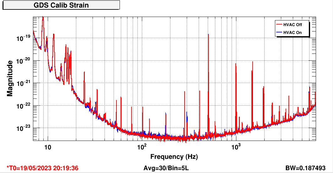 This plot is a bit out of date, but here is a DARM comparison for the time when the site HVAC was off. The range improvement from this HVAC shutoff that gained us about 10 Mpc appears to be a reduction in noise from 100-200 Hz in DARM. I think that region is mostly limited by jitter noise.