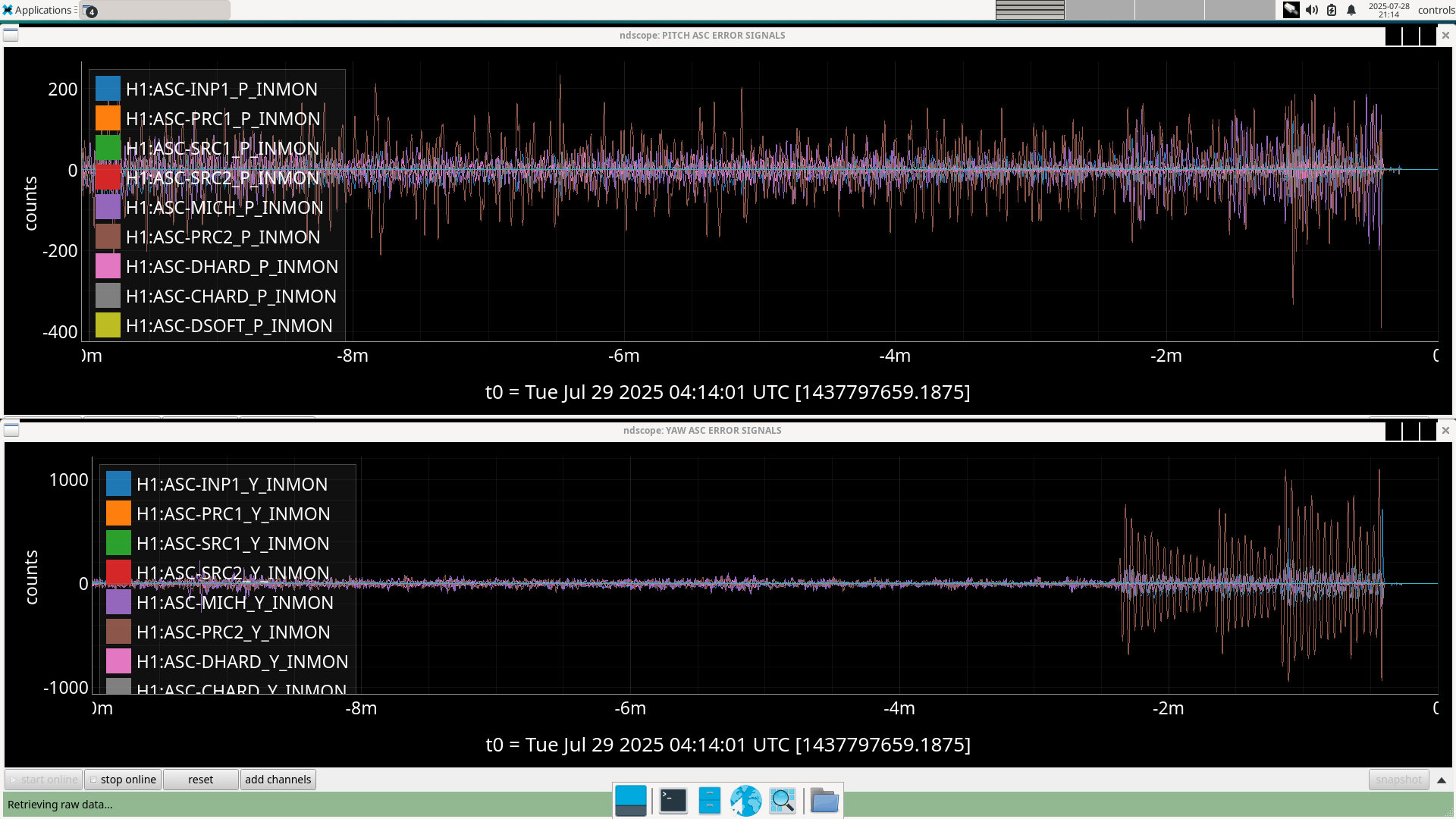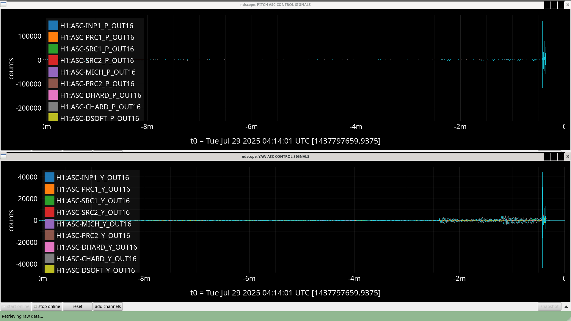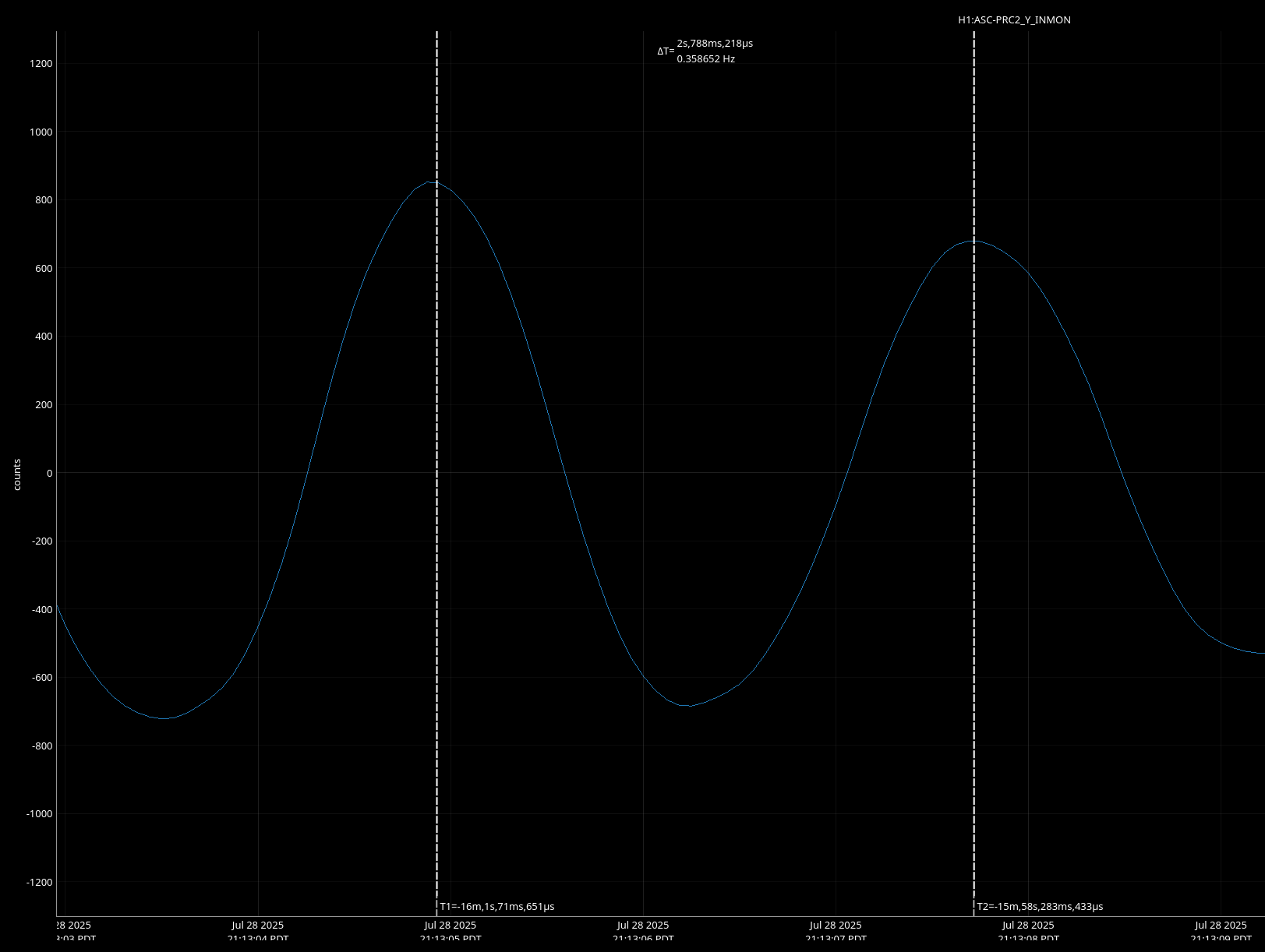 For locking, once we were back to "CALM", ran an uneventful alignment, and proceeded locking. The violins were a little elevated, but we've seen worse and after about 20min, H1 went to NLN, BUT only stayed locked a few minutes (no obvious culprits/symptoms on this lock). For the 2nd lock, did NOT run an alignment (but went to Check Mich Fringes +PRMI as per usual), this time H1 did not need to wait extra for violins, BUT in the 1-2 minutes prior to completing the NLN state, there were 0.36 Hz oscillations in ASC (biggest on yaw channels) and then there was a lockloss 30sec after NLN.