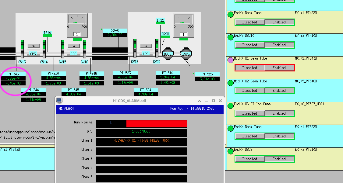While PT343 gauge is valved out and reading a higher pressure than normal for the next day or so several changes have been made to the alert/alarm systems: